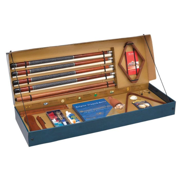 - Cue Accessories: Wooden six-cue rack, deluxe cue repair kit, and six Aramith chalks.