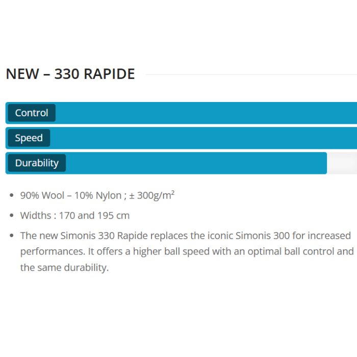 Upgrade your table with the Simonis 330 Rapide Carom Cloth, engineered for serious carom billiards, three‑cushion play and artistic disciplines. Thanks to its advanced weave and premium materials (90% wool / 10% nylon; approx. 300 g/m²), the 330 Rapide delivers higher ball speed, exceptional control and professional durability.